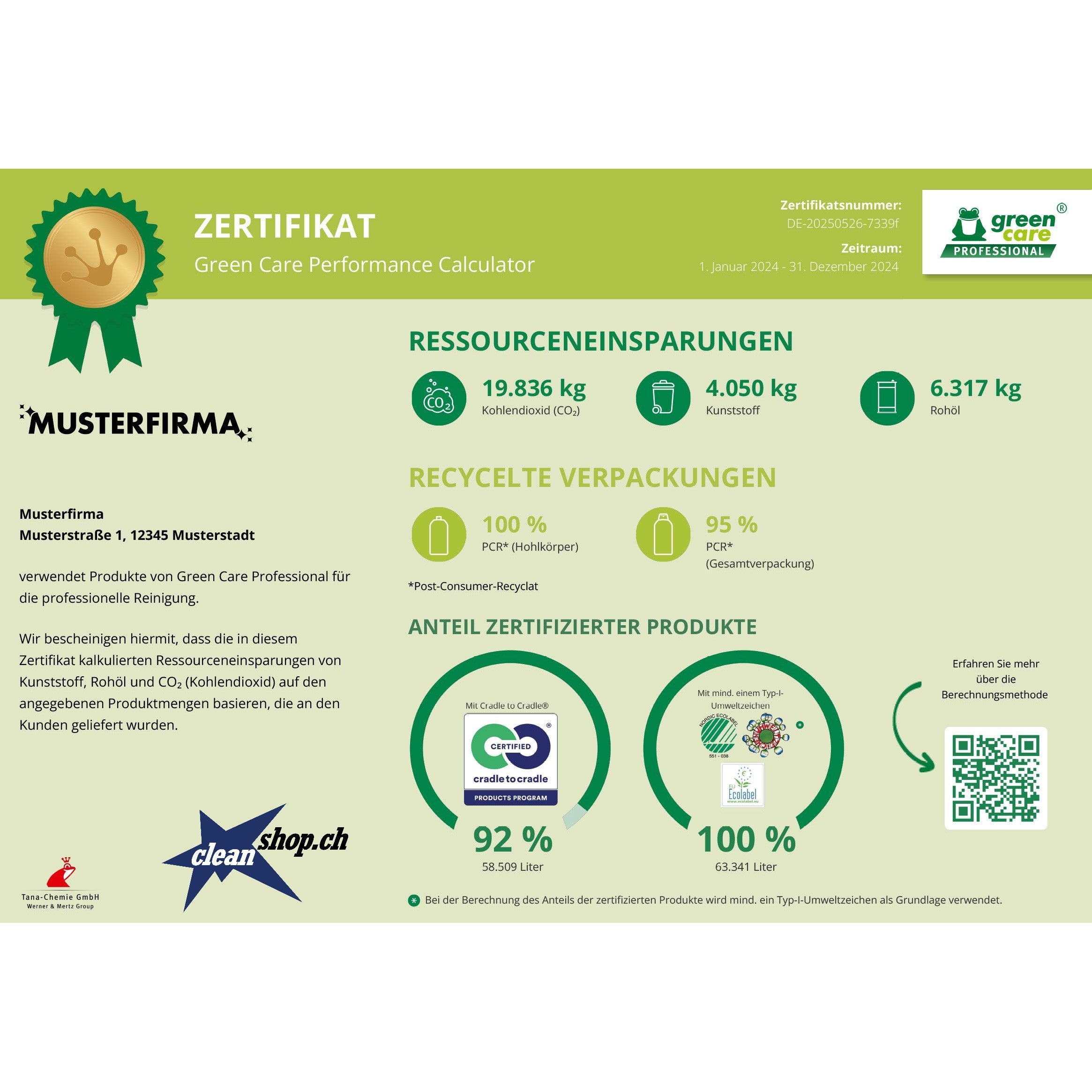 Berechnen Sie jetzt den nachhaltigen Impact Ihres Unternehmens und machen Sie sichtbar, wie verantwortungsvoll Sie handeln. Mit unserer ganzheitlichen Green Care Beratung erhalten Sie nicht nur Unterstützung bei der Umstellung auf kreislauffähige Reinigungsprodukte, sondern auch ein offizielles Nachhaltigkeitszertifikat mit eigenem Firmenlogo – als überzeugendes Argumentarium gegenüber Kund:innen, Geschäftsleitung und weiteren Stakeholdern.